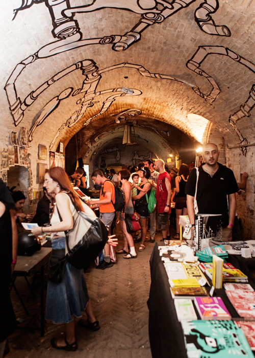 Ora non so se avete presente un po’ come è fatto il Forte Prenestino, cioè è un antico forte militare, nel cuore del quartiere di Centocelle, occupato negli anni ’80 e divenuto oggi uno storico centro sociale. Il Festival si svolge nei suoi sotterranei che, come in ogni Forte che si rispetti, in antichità servivano per serbare cibo e munizioni, quindi sono lunghissimi corridoi, ritmati da piccole “celle”, e in ognuna di queste celle ci trovate uno o più artisti diversi, oppure collettivi.