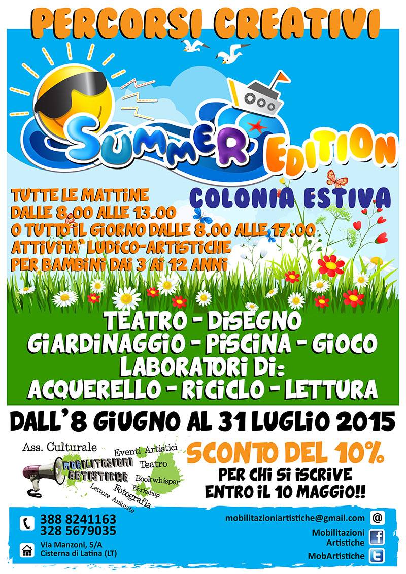 Percorsi creativi – Summer edition… Pronti per l’estate? Posted on Maggio 6, 2015 by mobilitazioniartistiche Lascia un commento Condividi:Tweet Fai clic per condividere su Telegram (Si apre in una nuova finestra) Telegram Fai clic per condividere su WhatsApp (Si apre in una nuova finestra) WhatsApp Mi piace Caricamento... Correlati tagged with bambini, colonia estiva, estate, laboratori creativi, letture animate, news, teatro Appuntamenti Percorsi creativi - Summer edition